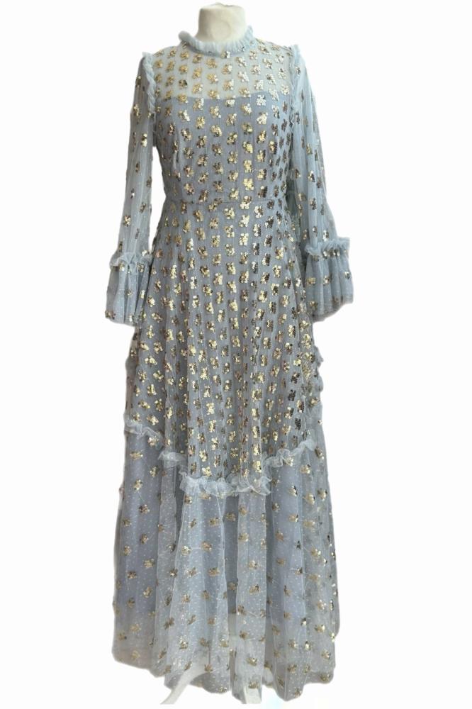فستان سهرة طويل بلون أزرق سماوي، مزين بالكامل بترتر ذهبي على شكل أزهار، ويتميز بياقة عالية وأكمام طويلة، وتنورة واسعة بطبقات من الكشكشة.