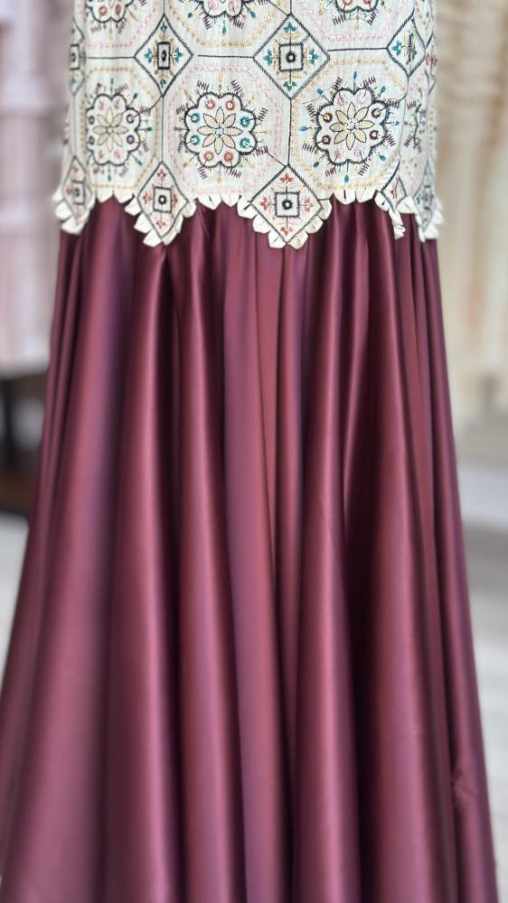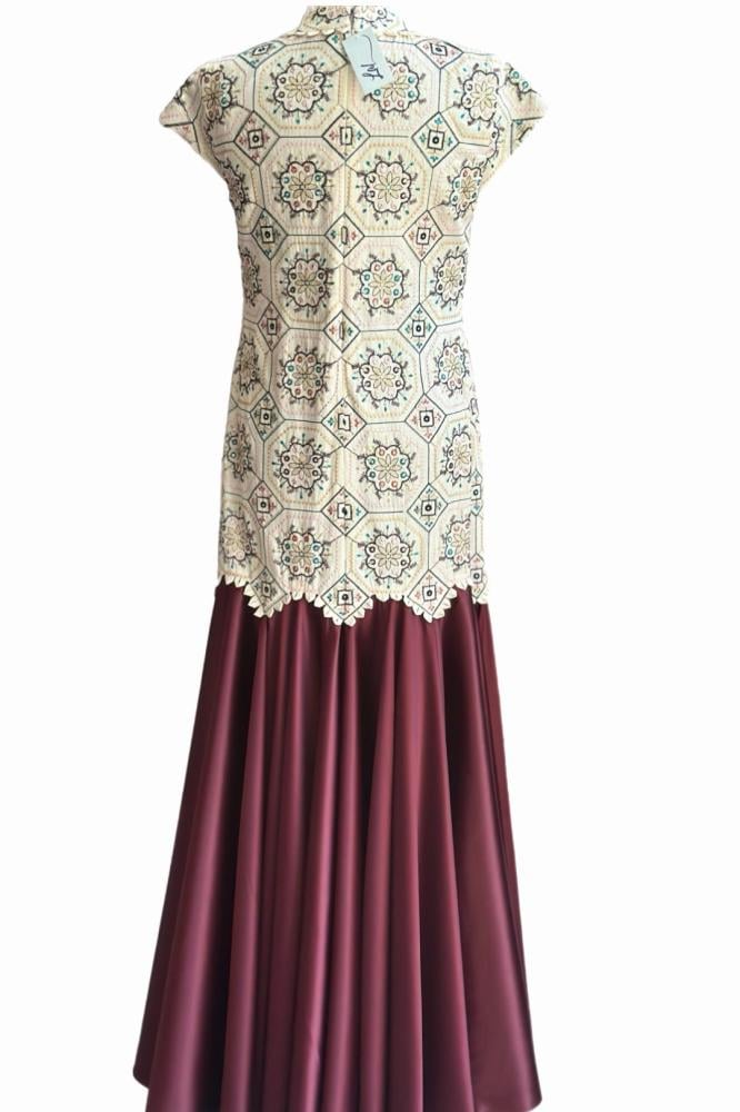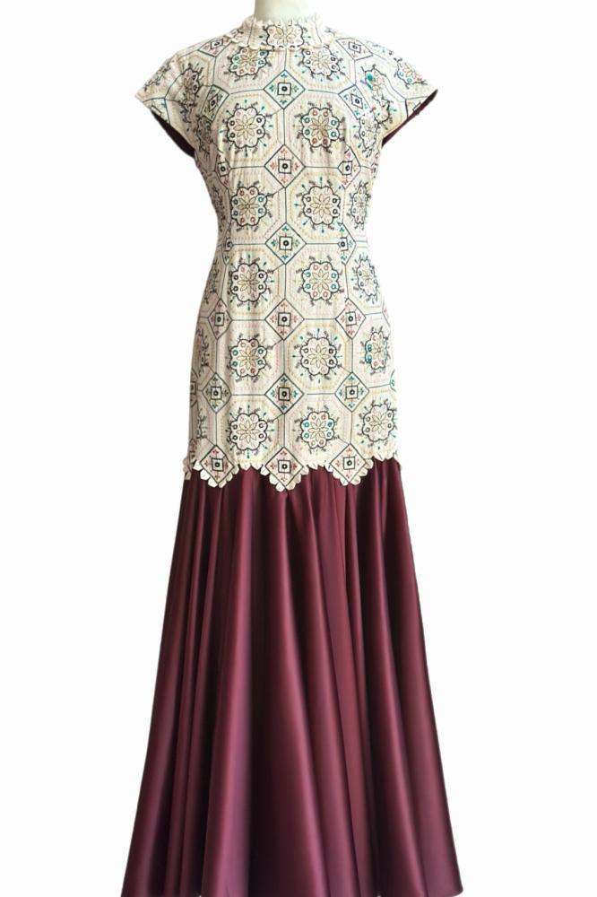 فستان طويل أنيق يجمع بين تطريزات ملونة بنقوش هندسية وزهرية في الجزء العلوي ذي الياقة والأكمام القصيرة، وتنورة واسعة ولامعة بلون عودي داكن.