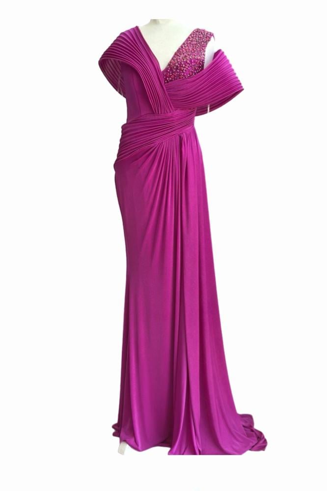فستان سهرة فاخر بلون بيج ناعم، يتميز بتصميم غير متماثل مع تفاصيل كشكش ملفوفة تضفي حركة وأناقة، مزين بترصيع لامع على جانب الصدر لزيادة الفخامة. مناسب للمناسبات الرسمية والسهرات الراقية.