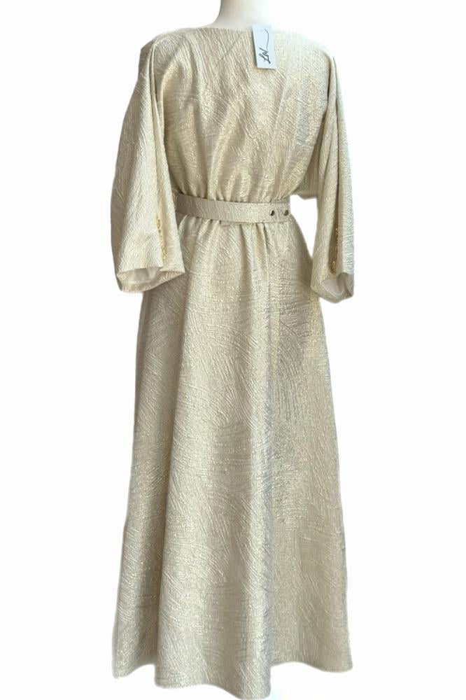 فستان طويل أنيق باللون البيج الفاتح ، يتميز بنسيج مزخرف ولامع يمنحه مظهرًا فاخرًا. يتميز الفستان بأكمام واسعة وتطريزات ذهبية أنيقة مرصعة بالخرز على منطقة الصدر وعند أطراف الأكمام، بالإضافة إلى حزام مطابق عند الخصر مزين بإبزيم كبير ولامع. الفستان مناسبًا للمناسبات الرسمية أو الاحتفالية.