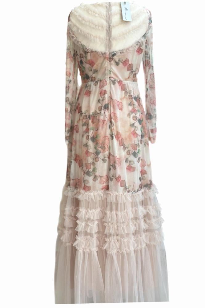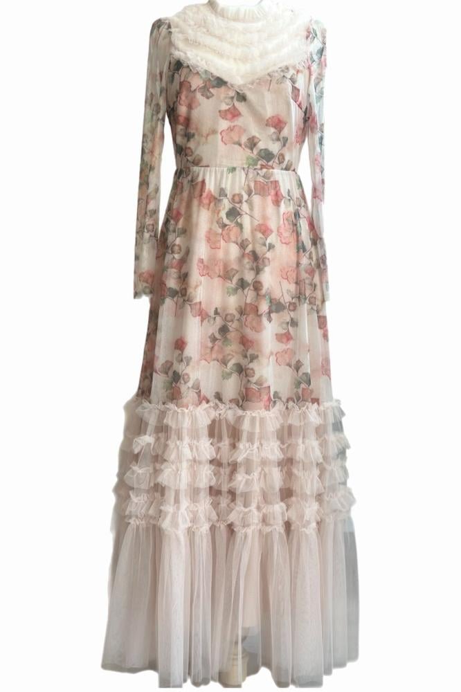 فستان طويل أنيق بلون بيج فاتح، يتميز بنقشة أوراق شجر وزهور باللونين الوردي والأخضر. الفستان ذو ياقة عالية مزينة بكشكشة ناعمة من التول، وأكمام طويلة شفافة. الجزء السفلي من الفستان متعدد الطبقات مع كشكشة من التول، مما يضفي عليه مظهرًا أنثويًا وناعمًا، وهو مناسب للمناسبات الخاصة أو الاحتفالات.