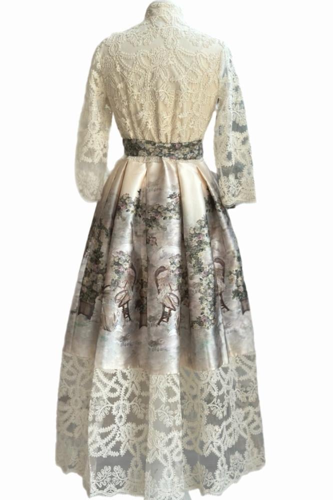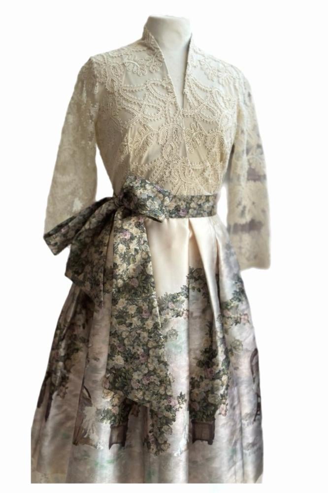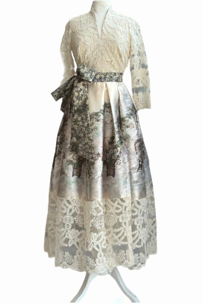 فستان يجمع بين دانتيل كريمي في الجزء العلوي والأكمام وياقة عالية، وتنورة حريرية بطول متوسط مزينة بطبعة فنية لمشهد طبيعي ، ويكملها حزام عريض مربوط بفيونكة.