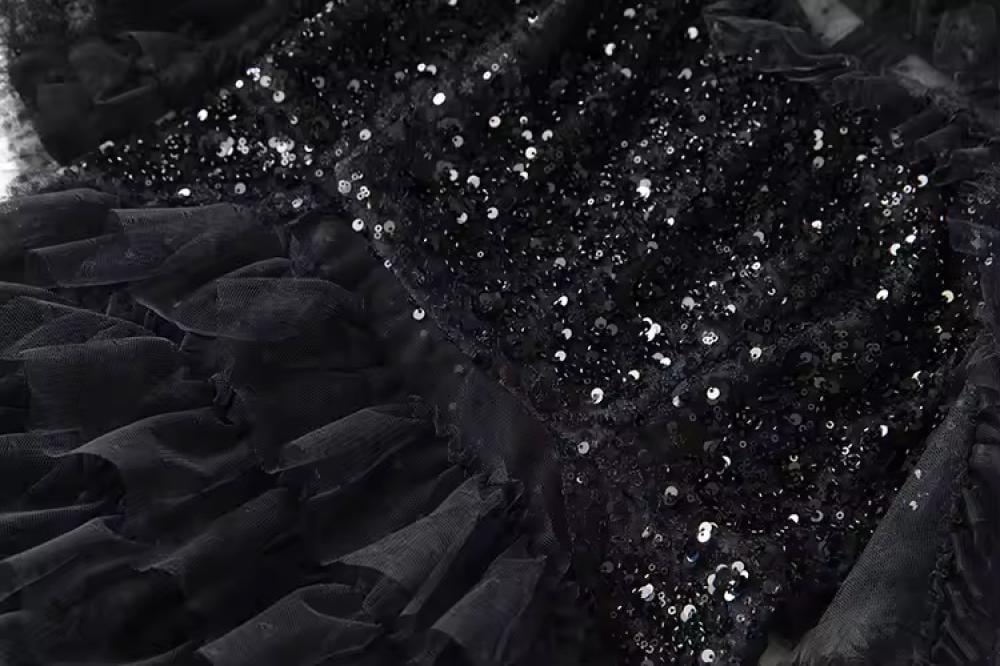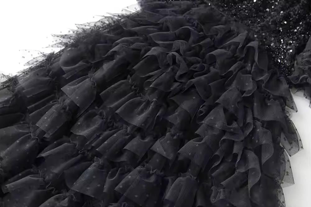 فستان أسود أنيق بتصميم راقٍ، يتميز بترتر لامع في الصدر وأكمام شفافة واسعة، مع تنورة بطبقات كشكش متدرجة تمنحه لمسة فخامة وجاذبية مثالية للسهرات.