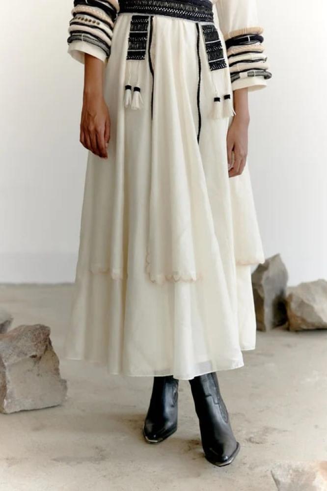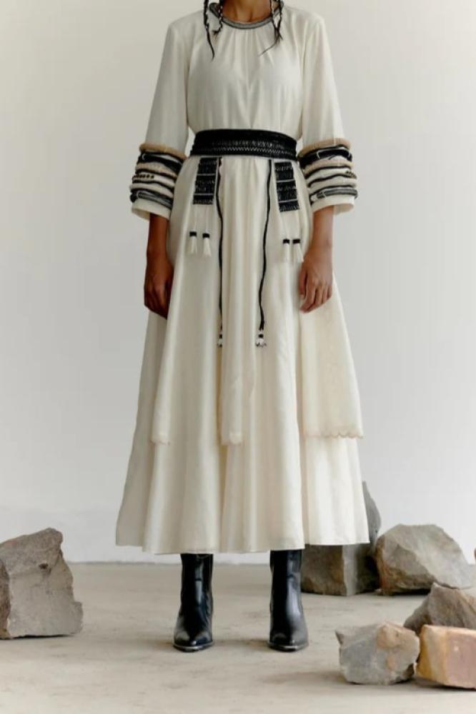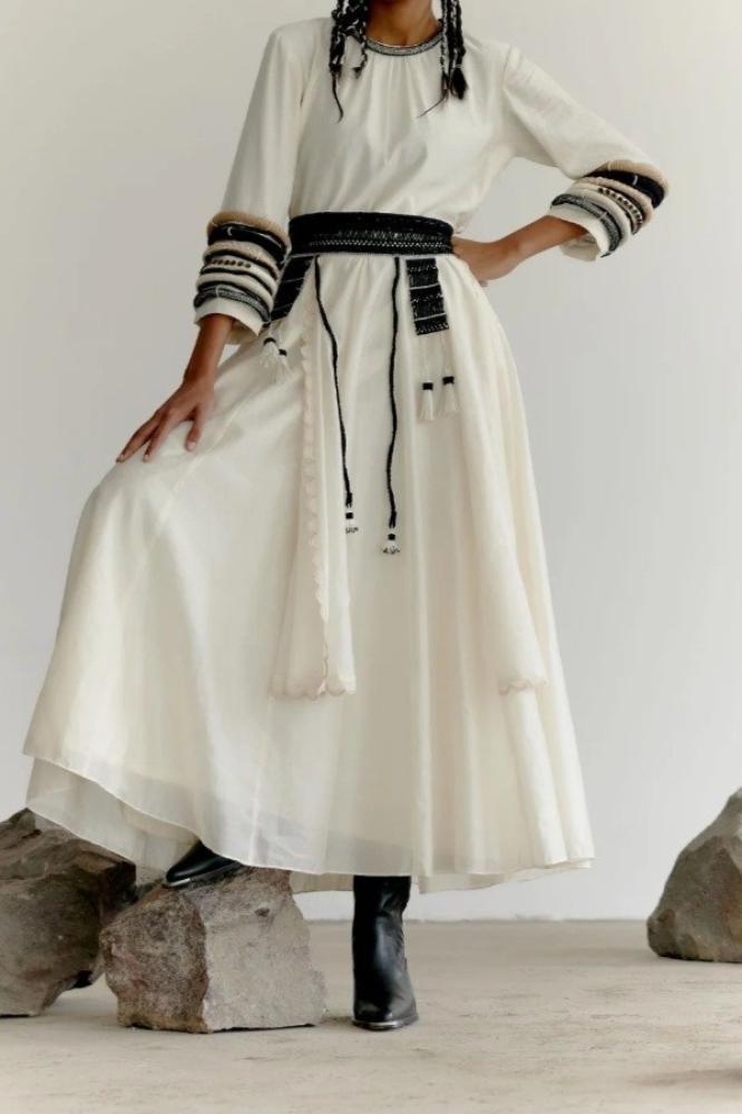 فستان هندي طويل باللون العاجي، مصنوع من قماش خفيف بتفاصيل تطريز يدوي على الأكمام وحزام أسود مطرز يبرز جمال الخصر، يجمع بين الأصالة الهندية والفخامة العصرية في تصميم راقٍ وانسيابي.
