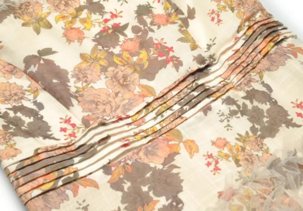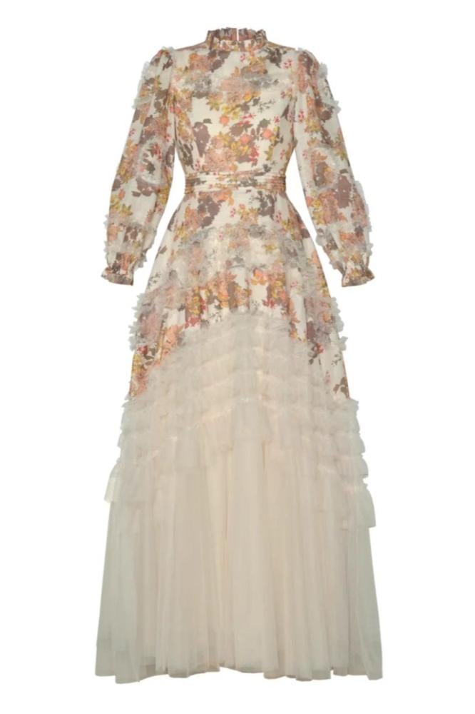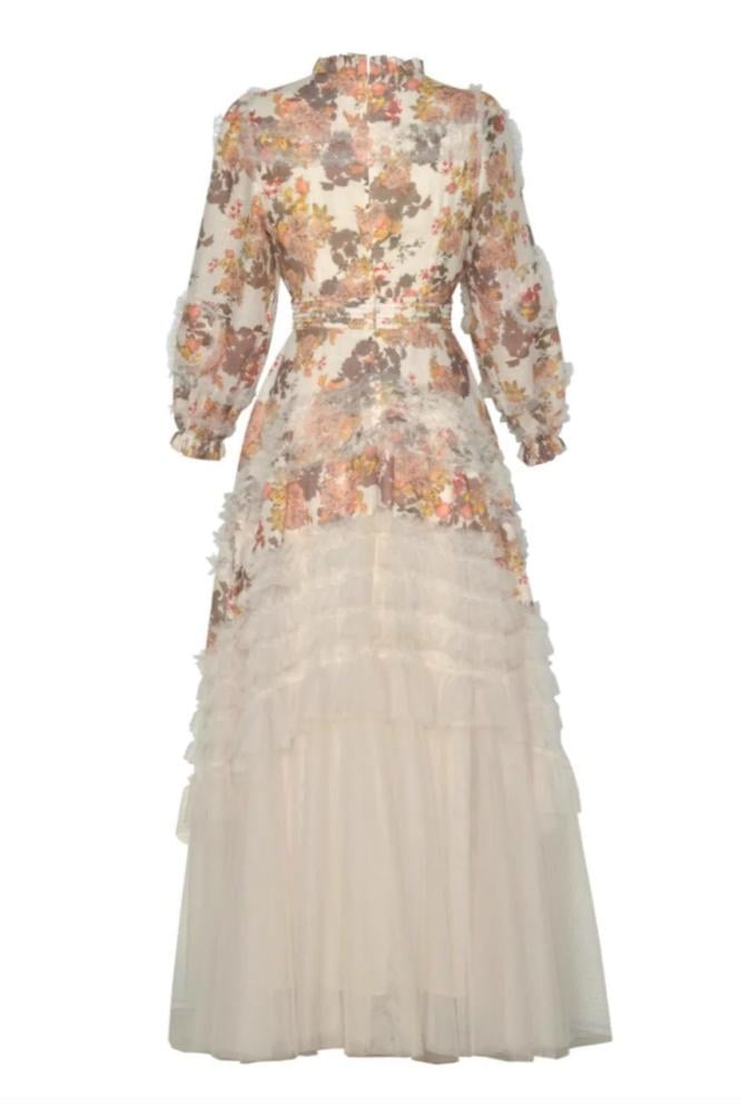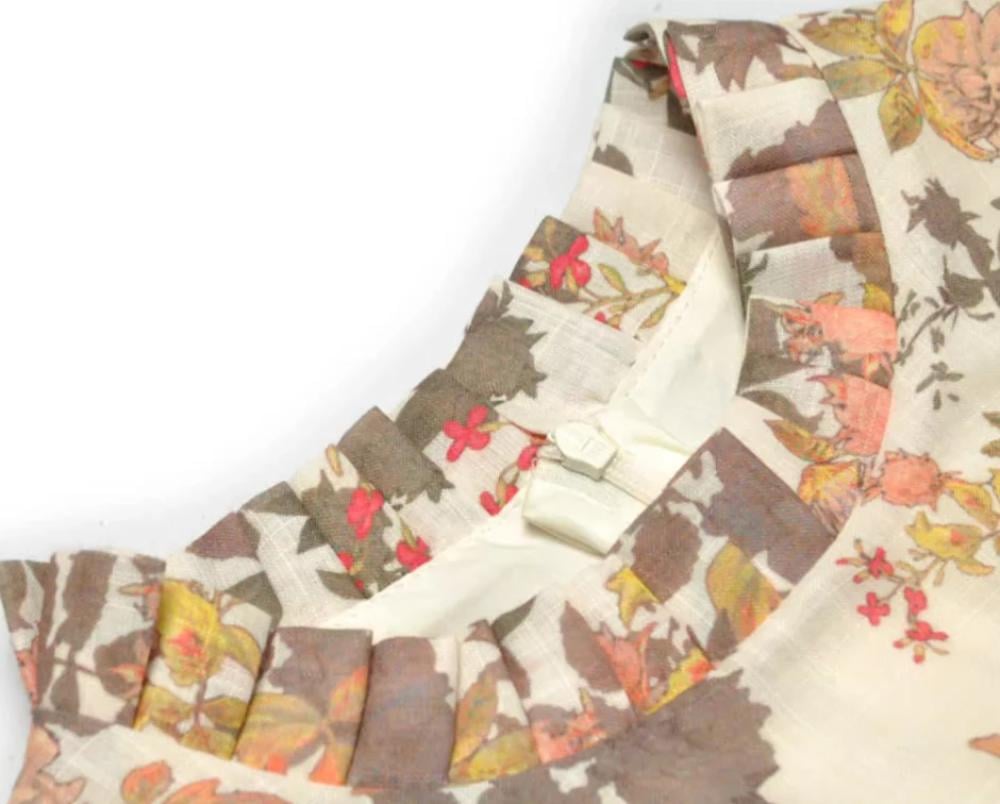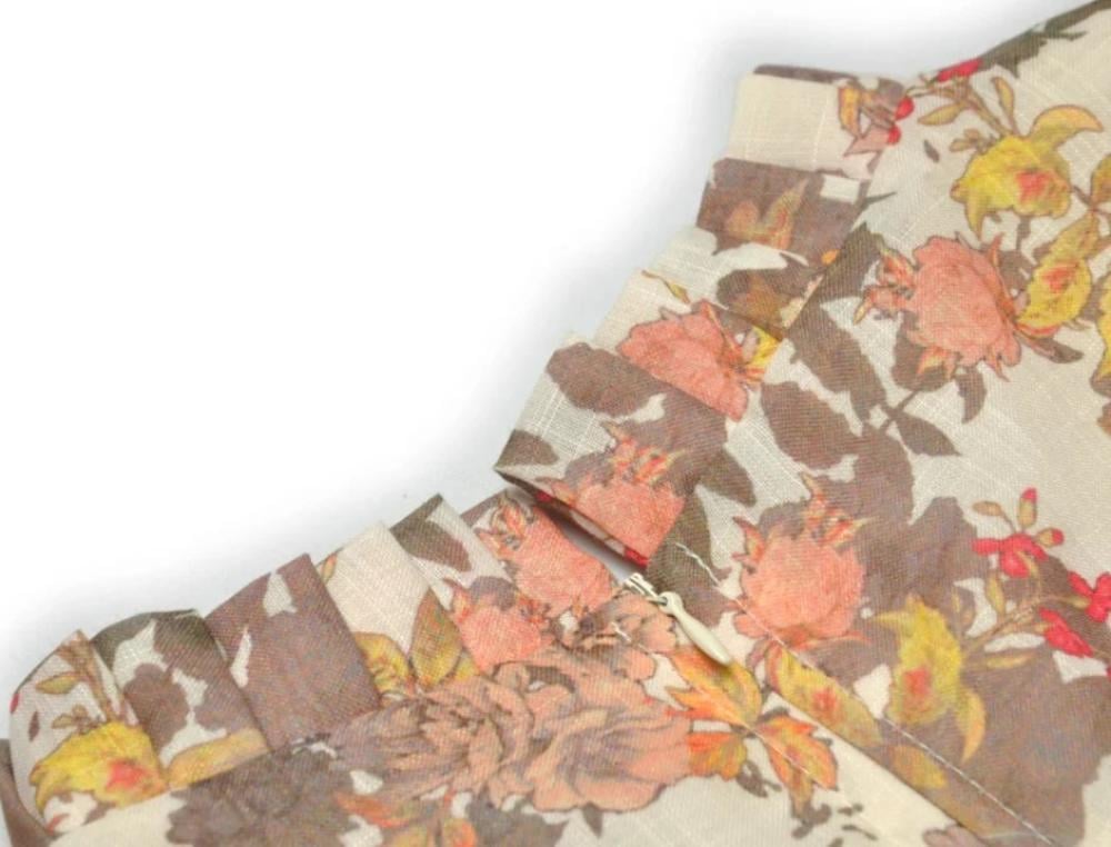 يتميز الجزء العلوي منه بتصميم بياقة عالية مكشكشة وأكمام طويلة منتفخة قليلاً عند الأكتاف تنتهي بكشكشة ناعمة. القماش في الجزء العلوي مزين بطبعة زهور رقيقة بألوان ترابية ودافئة مثل البيج، الوردي الباهت، والبرتقالي المحروق، مع شريط خصر رفيع يحدد القوام.