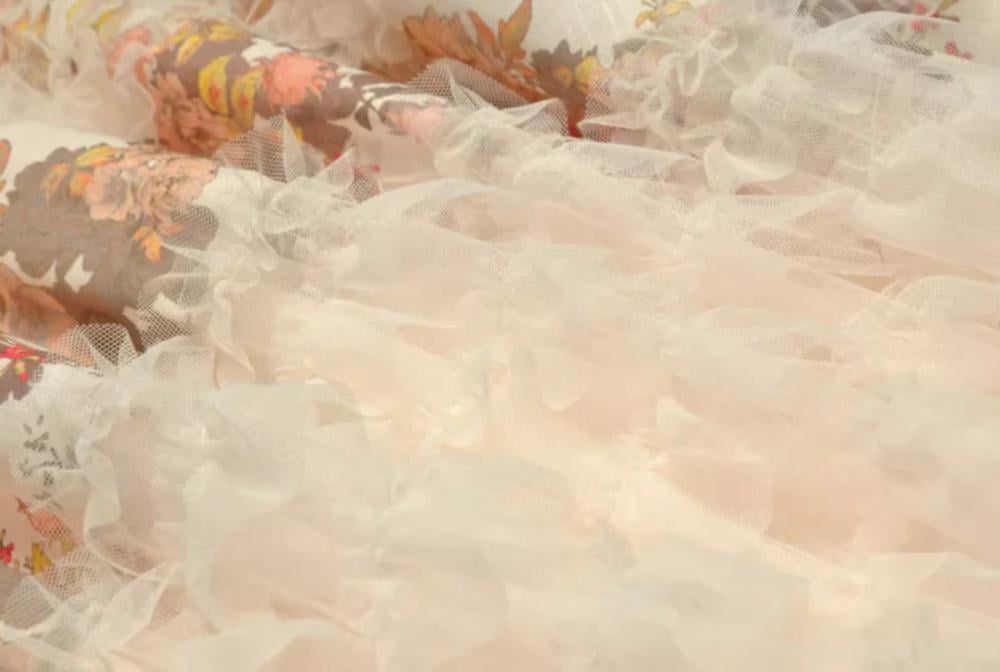 أما الجزء السفلي، فيتكون من تنورة طويلة متدرجة ومزدانة بطبقات كثيفة من الكشكشة والتول بلون بيج عاجي، مما يضيف عليه حجماً وحركة ناعمة. مثالي لمناسبة مسائية أو حفل.