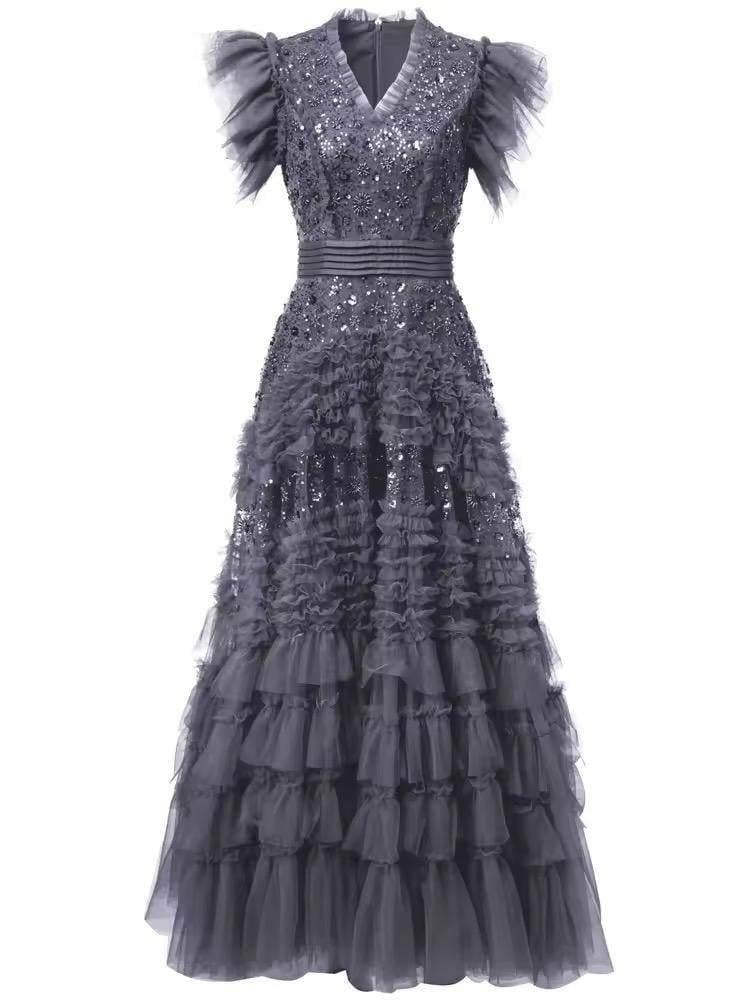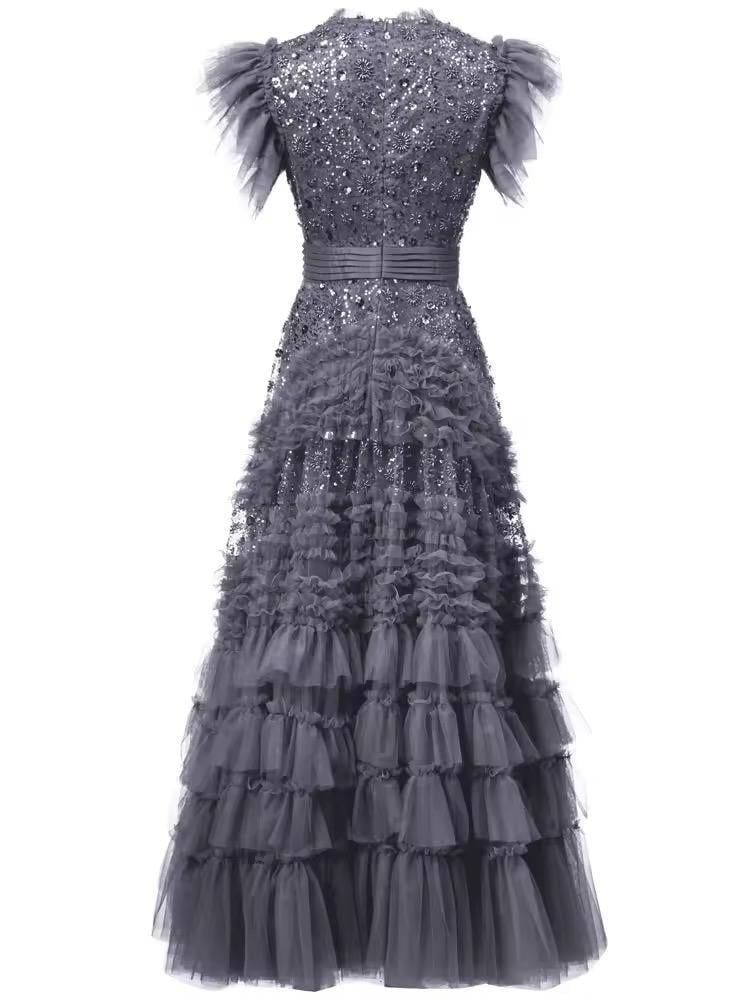 فستان سهرة طويل بلون رمادي، مزين بالترتر والخرز اللامع. يتميز بياقة على شكل حرف V، وأكمام منفوشة من التول، وتنورة متعددة الطبقات من الكشكشة.