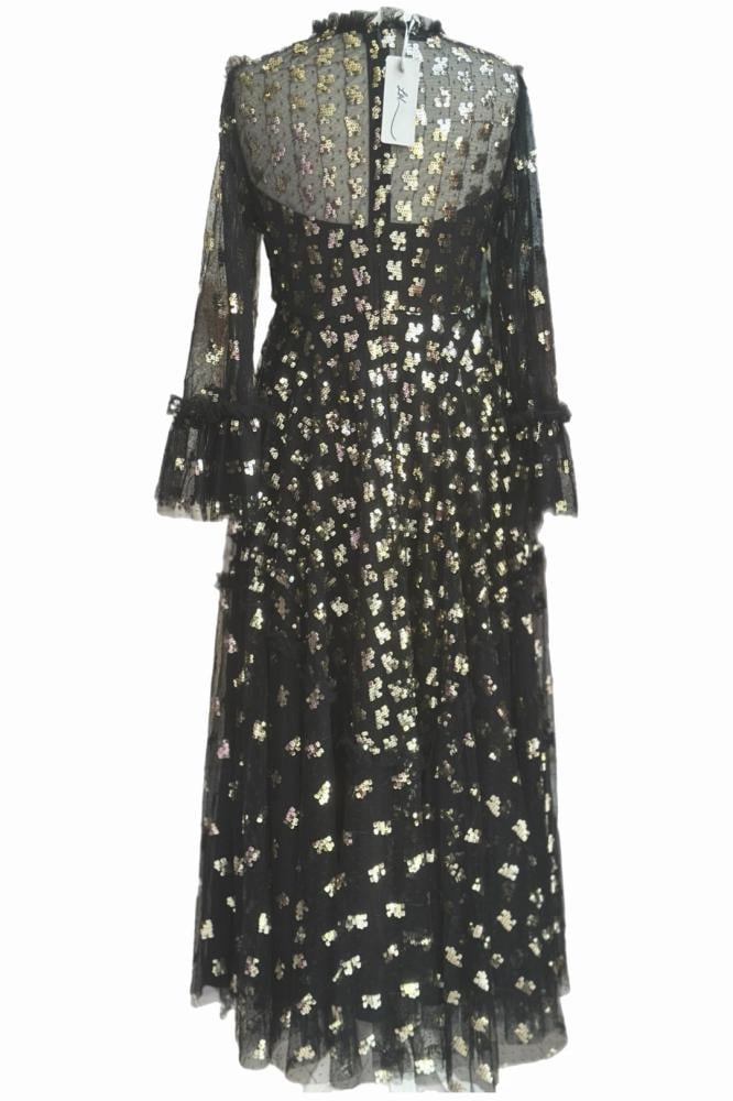 فستان سهرة طويل أنيق متوفر بلونين: الأسود و الذهبي. كلا الفستانين يتميزان بزخرفة كاملة من الترتر اللامع بنمط متناثر وشبه تجريدي. الفستان ذو ياقة عالية مكشكشة وأكمام قصيرة انسيابية بحواف مكشكشة. يتميز الفستان بخصر محدد يتسع إلى تنورة واسعة بقصة A-line، مما يخلق إطلالة راقية وجذابة."