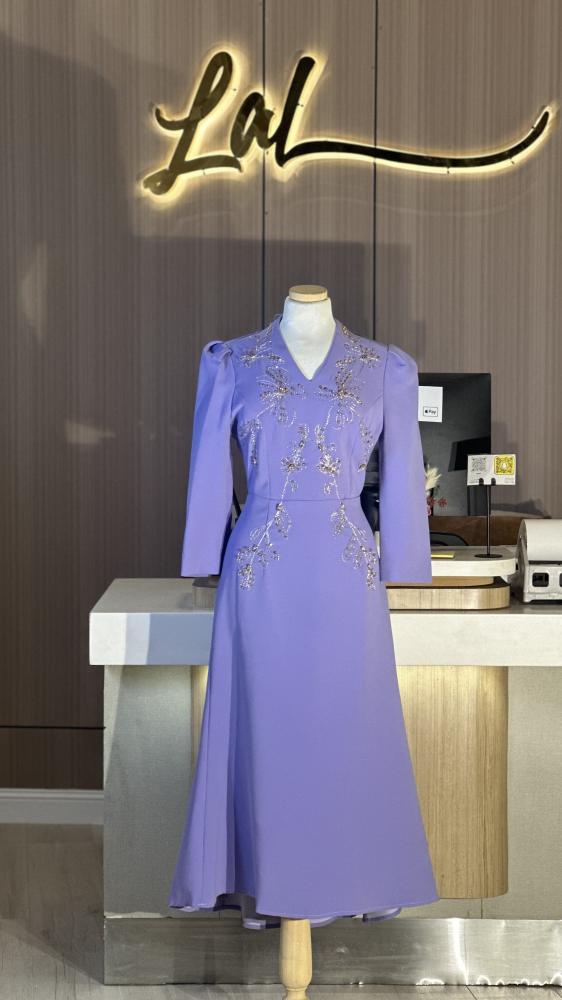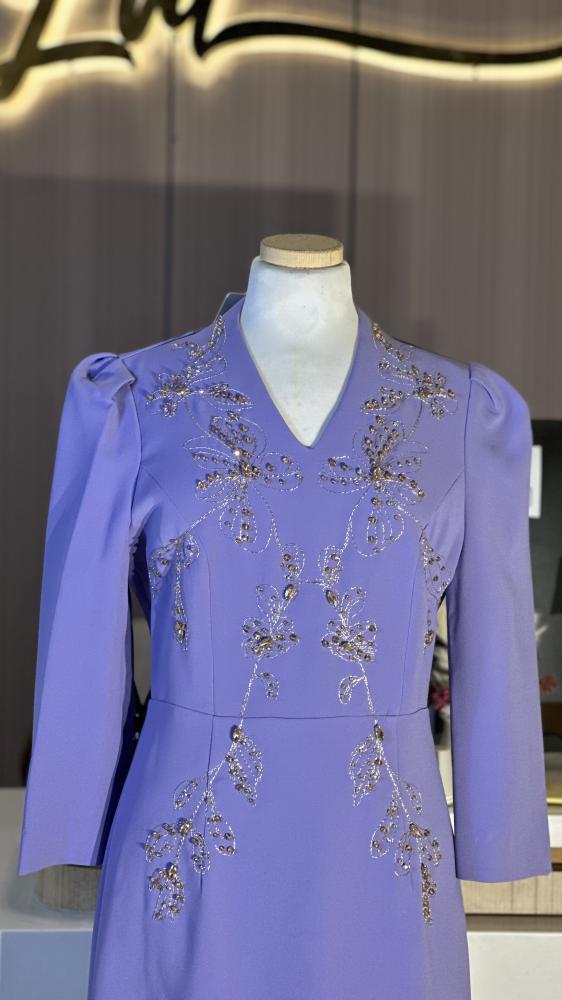 فستان باللون البنفسجي يتميز بقصّة كلاسيكية راقية. يأتي بتصميم بكمّ طويل مع أكتاف مرفوعة قليلًا لإضافة لمسة من الفخامة. كما يزين الجزء العلوي تطريز فاخر على شكل فروع نباتية مرصعة بالخيوط اللامعة والكريستالات، مما يمنحه إطلالة راقية وجذابة.