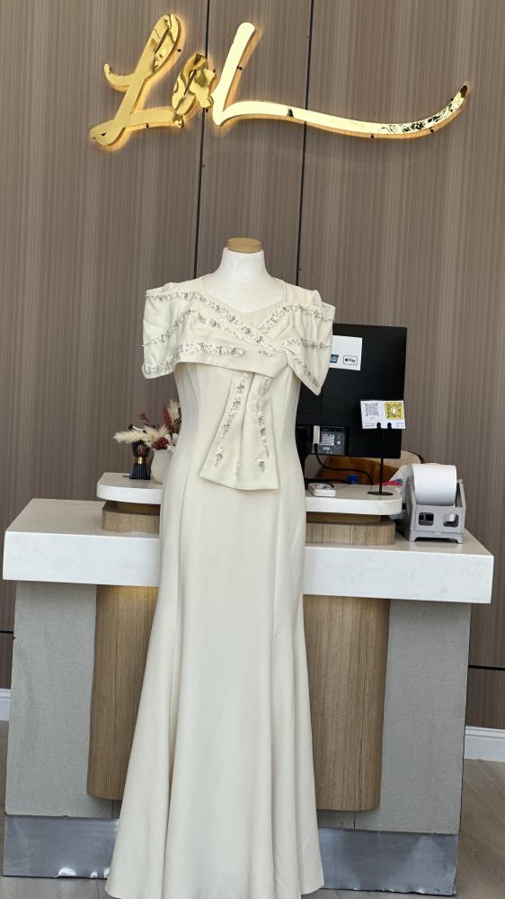 فستان ناعم بقصة انسيابية أنثوية وتصميم أنيق بكتف مكشكش مزين بتطريز لؤلؤي ناعم، يضفي لمسة فخمة وعصرية في آنٍ واحد. مثالي للمناسبات الراقية أو العزائم المسائية.