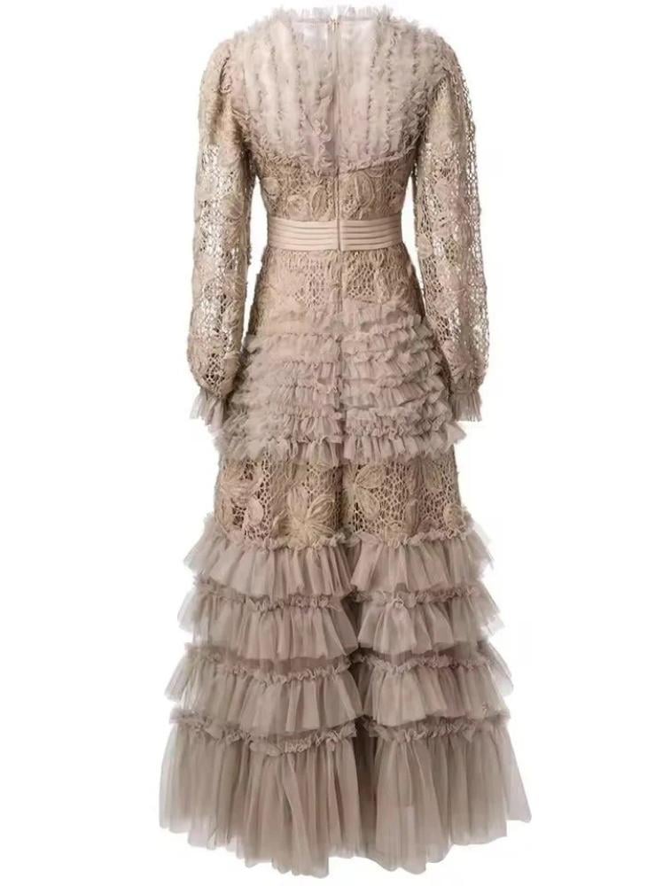 فستان أنيق باللون البيج الفاتح، يجمع بين الدانتيل الفخم والتول الناعم بطبقات كشكش متدرجة تضيف حجمًا وحركة أنثوية مميزة. يتميز بياقة مرتفعة مزينة بتفاصيل ناعمة، وأكمام طويلة من الدانتيل الشفاف، مع حزام يحدد الخصر ليمنح إطلالة راقية ومثالية للسهرات والمناسبات الخاصة.