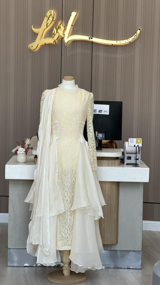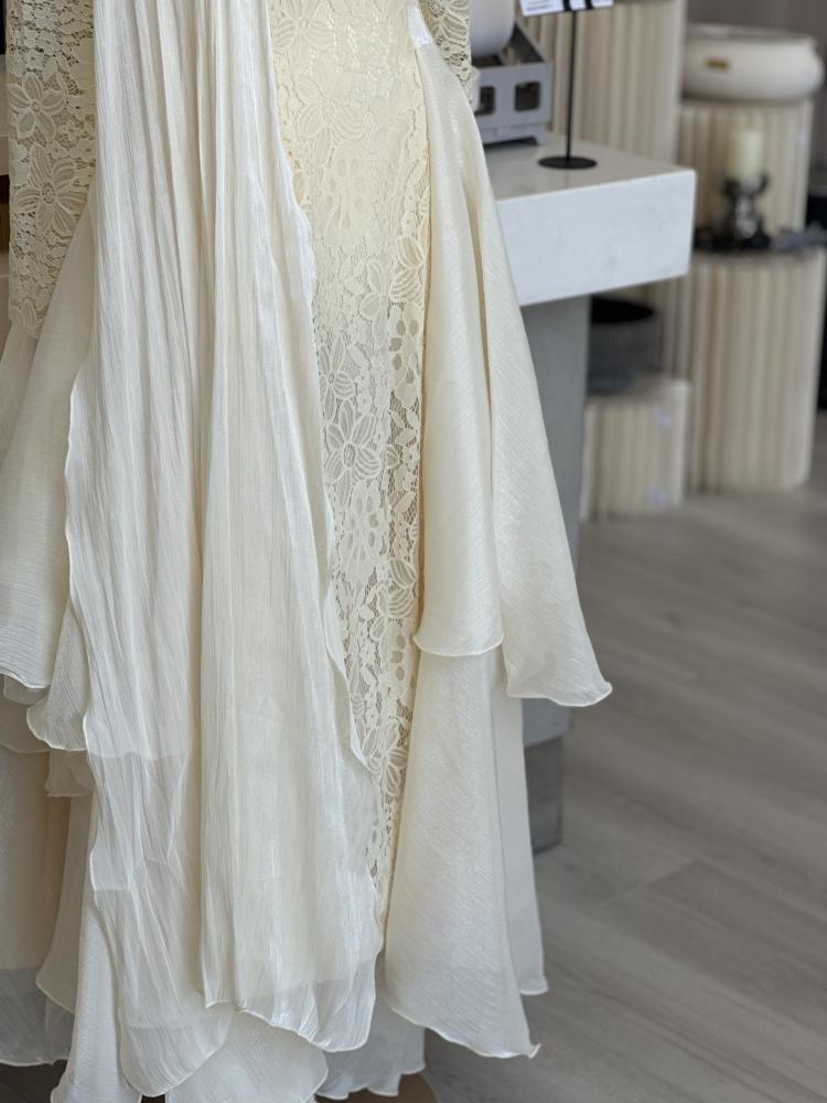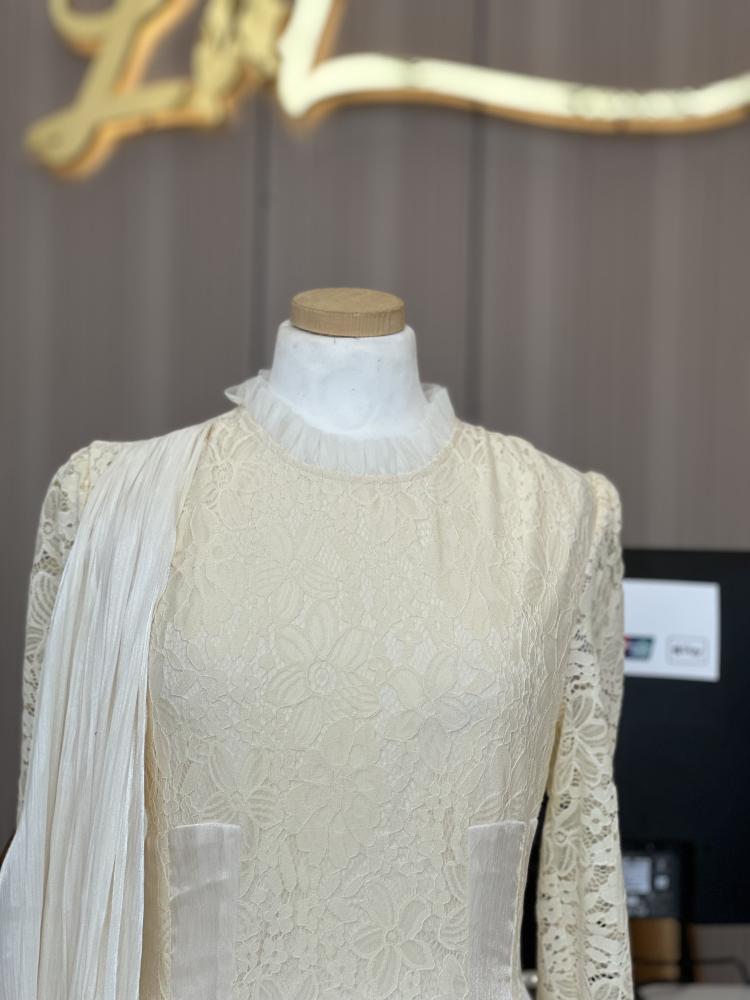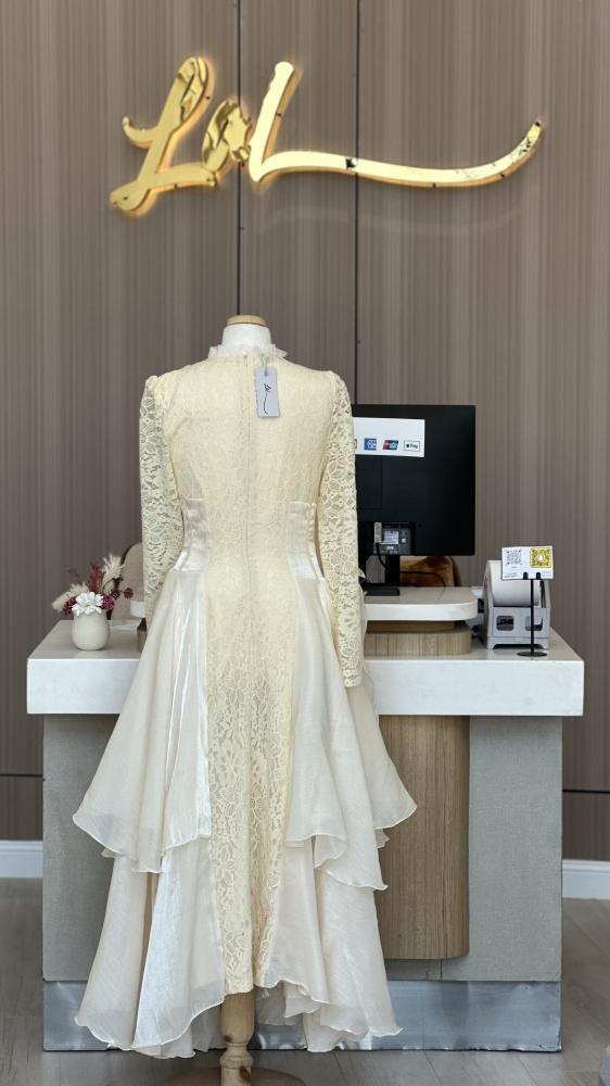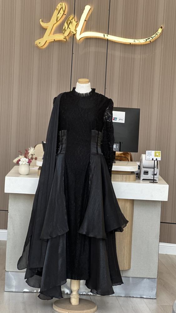 فستان أنيق بطابع كلاسيكي مصنوع من الدانتيل مع طبقات شيفون ناعمة، يتميز بتصميم محتشم وأكمام طويلة ورقبة عالية، متوفر بلونين: العاجي والأسود، مثالي للمناسبات الراقية.