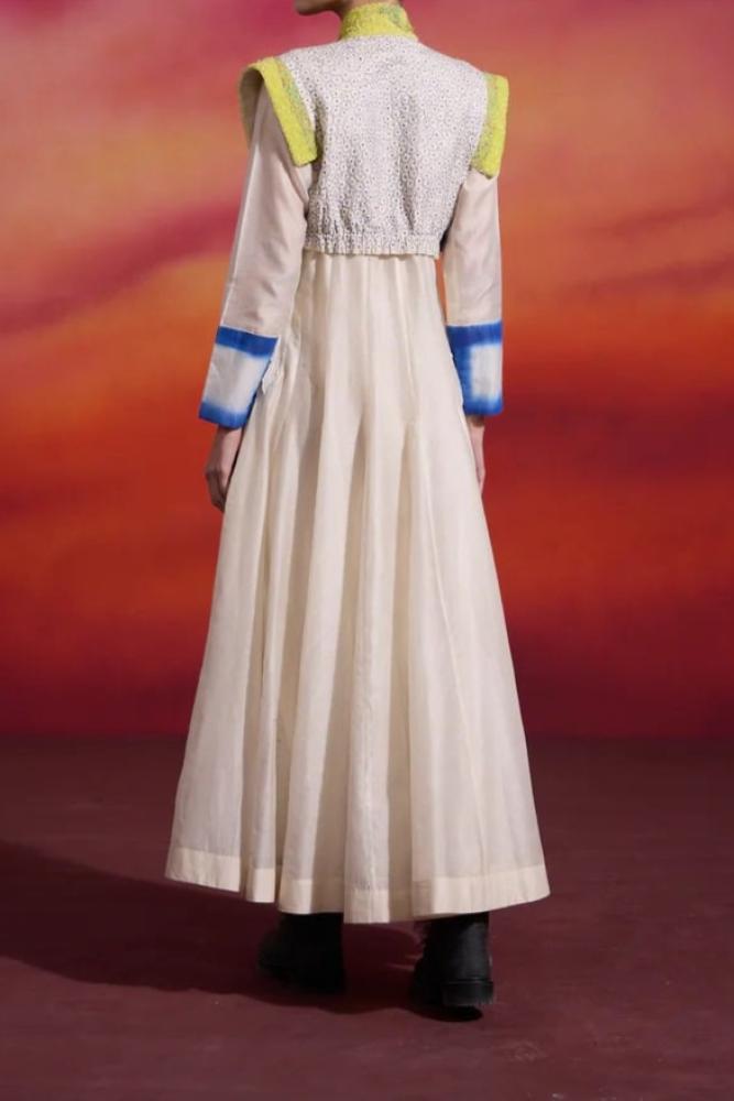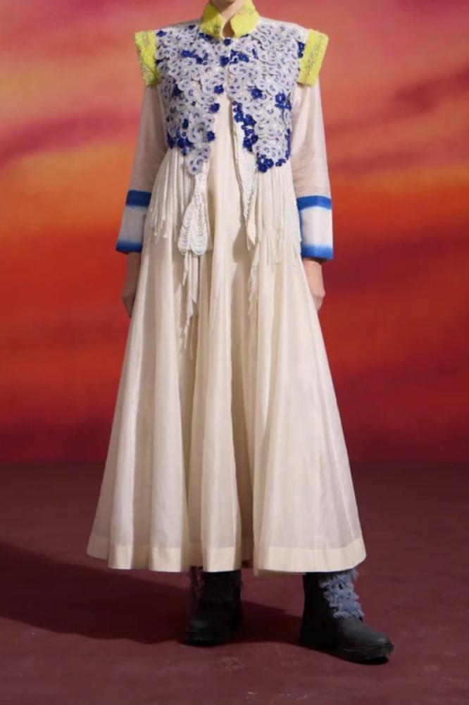 جاكيت مطرز يدويا من الحرير العاجي شانداري مزين بلوحة غير متماثلة من الخرز وقميص من الأورجانزا الحريرية المزدوجة وفستان حريري من العاج مع أساور مرسومة يدويا