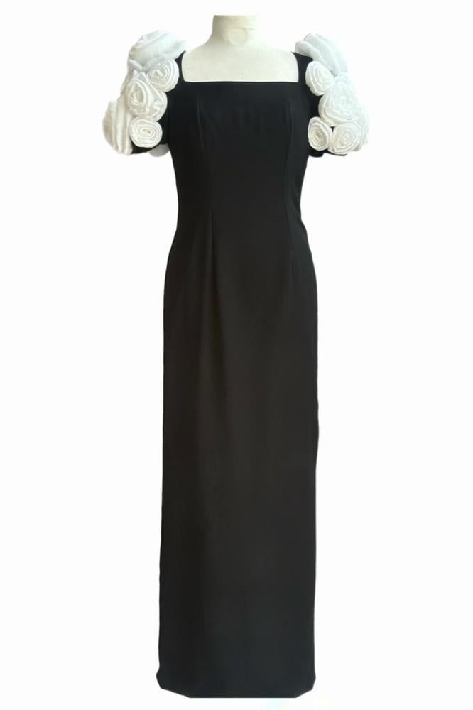 فستان سهرة طويل بلون أسود سادة، يتميز بقصة مستقيمة ضيقة. ياقة الفستان مربعة، وتفاصيله الأبرز هي الأكمام القصيرة المزينة بوردات بيضاء بارزة وكبيرة الحجم. الجزء الخلفي من الفستان مزود بسحاب إغلاق في الجزء العلوي وفتحة (شقة) طويلة في منتصف التنورة من الأسفل، مما يضيف لمسة أنيقة وعملية للحركة.
