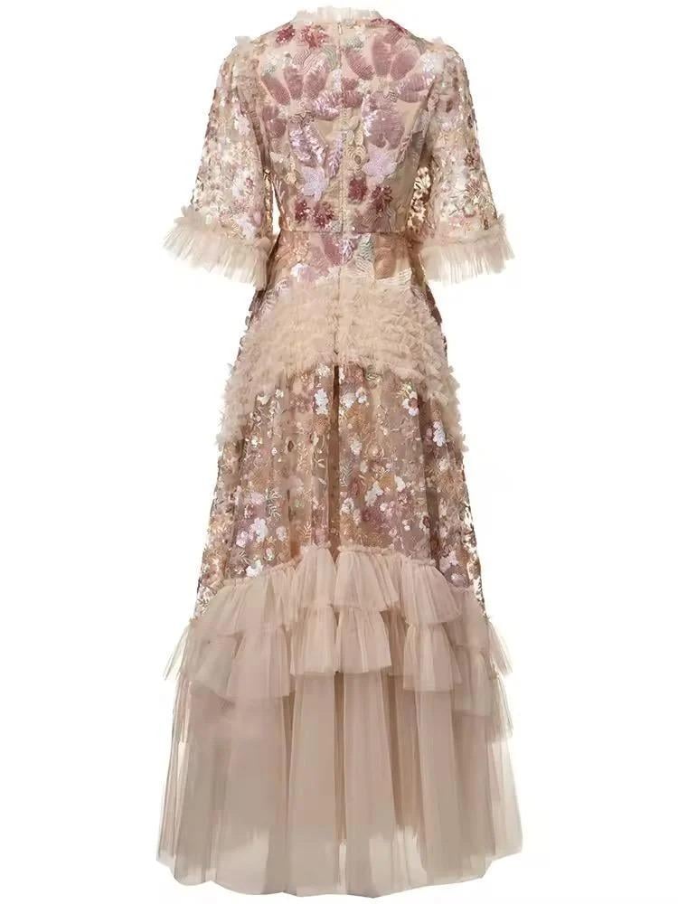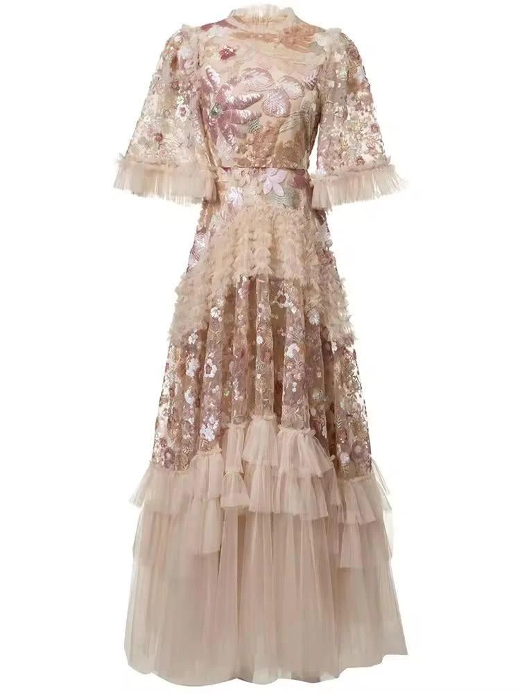 فستان سهرة طويل أنيق بلون وردي باهت، مزين بتطريزات كثيفة على شكل أوراق شجر وزهور بألوان متعددة مع ترتر لامع. يتميز الفستان بياقة عالية، وأكمام متوسطة الطول تنتهي بكشكشة من التول. الجزء السفلي من الفستان متعدد الطبقات بكشكشة من التول، مما يضفي عليه مظهرًا فخمًا وأنثويًا. الفستان مناسب للمناسبات الرسمية والاحتفالات.