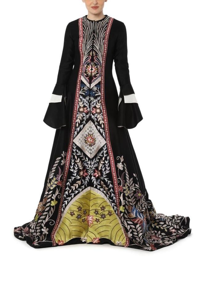 فستان أسود طويل بأكمام واسعة وأساور بيضاء، مزين بتطريزات ملونة في المنتصف والجزء السفلي. ياقة الفستان دائرية ومغلقة، و مناسباً للمناسبات الرسمية.