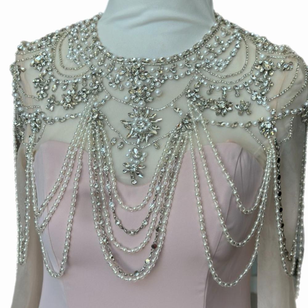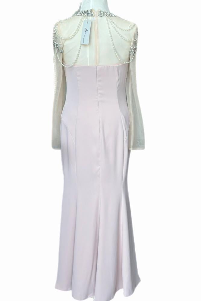 فستان يتميز بتصميمه الراقي والأنيق، حيث يأتي بقصة حورية البحر الضيقة من الأعلى وتتسع تدريجيًا نحو الأسفل، مما يبرز جمال القوام. لونه وردي فاتح أو بيج فاتح، ويتميز بوجود تطريز باللؤلؤ والخرز الفضي اللامع يغطي الأكتاف والصدر، وينسدل منه سلاسل من اللؤلؤ على الذراعين والظهر، مما يضيف عليه لمسة من الفخامة والرقي. الأكمام طويلة وشفافة، مما يكمل الإطلالة الأنيقة والمحتشمة.
