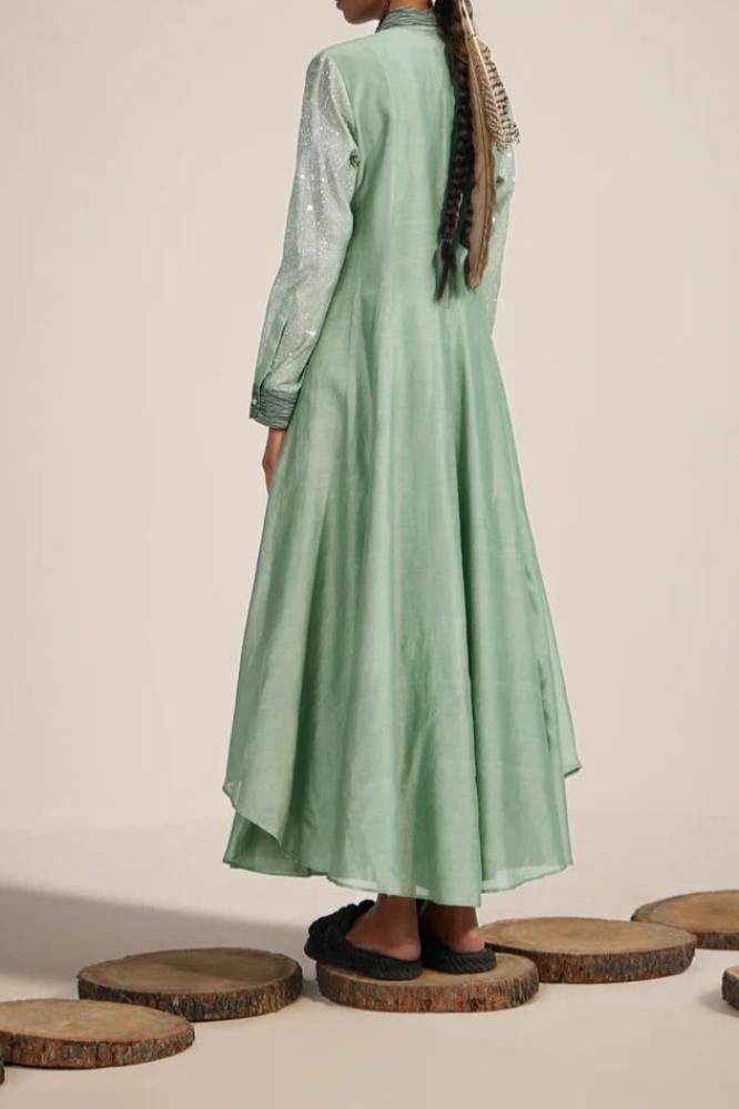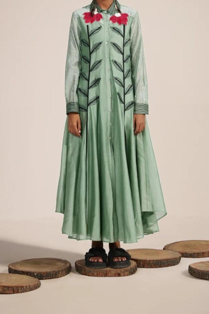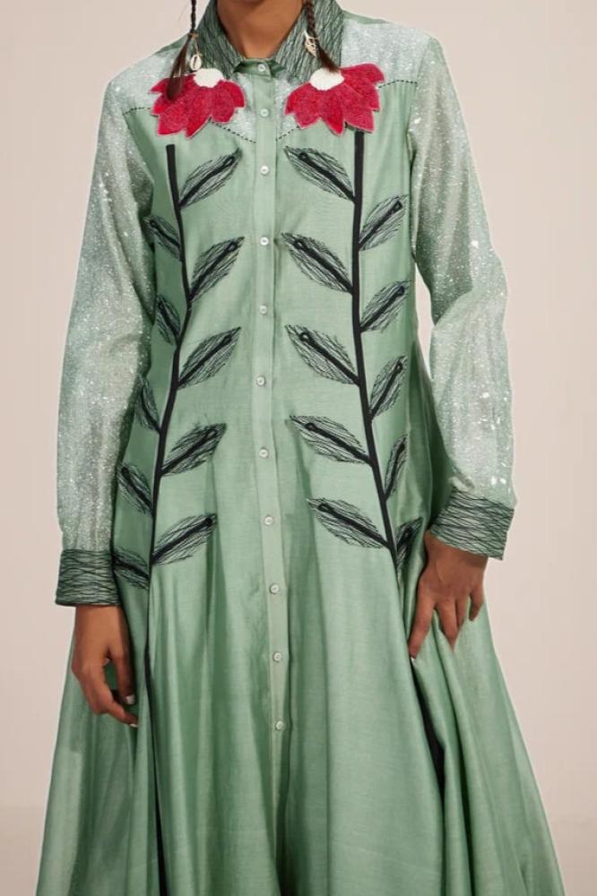 فستان قميص حريري شانديري باللون الأخضر الباهت مع نسيج يدوي وتفاصيل طلاء الرش